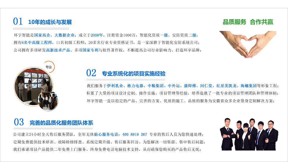 合肥市環(huán)宇智能工程有限公司成立于2008年,科創(chuàng)版上市企業(yè),現(xiàn)注冊資金1000整,電子與智能化系統(tǒng)集成資質(zhì)壹級,安防資質(zhì),是“國家高新技術(shù)企業(yè)”、“合肥市高新技術(shù)產(chǎn)品認(rèn)定企業(yè)”、“安徽省安防協(xié)會會員單位”、“AAA級信用等級認(rèn)證企業(yè)”、“AAA級重合同守信用企業(yè)”、“合肥市創(chuàng)新型企業(yè)”、是行業(yè)領(lǐng)先的智能化整體解決方案的集成商